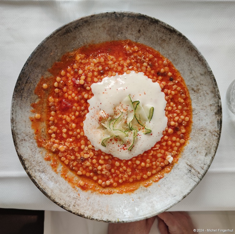 07/07/2024 @ 12:34:55 (plan)]]>"/>Main dish: Fregola Sarda (ball-shaped pasta), tomato, crushed zucchini, parmesan espuma ("foam").07/07/2024 @ 12:34:55 (plan)]]>
